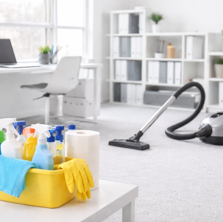 Routine maintenance to keep your workspace clean and organized — desks, surfaces, floors, kitchens, bathrooms, and trash removal.